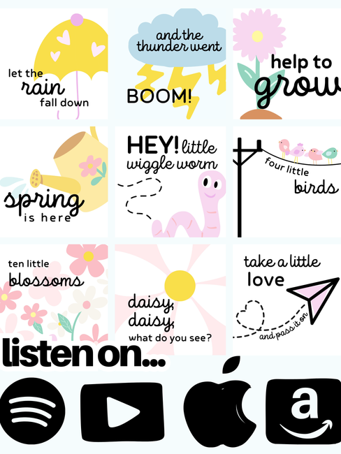 It alternates a more chill verse, identifying "signs of spring!" Rain and puddles, planting seeds and watching flowers grow, and birds flying to their nests! And SILLY CHORUSES, intended for movement! Jump and stomp in "puddles" as you "splishy, splashy!" Pretend to plant seeds and pull weeds as you're "digging, digging, digging, digging!" And fly like birds as you "flap flap" and "tweet tweet!"